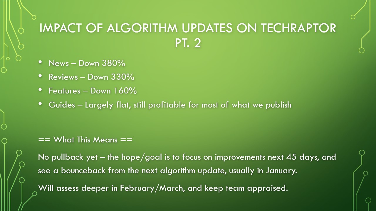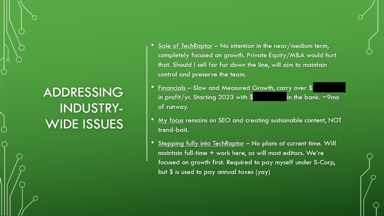 We’re nowhere near the size of giants like Polygon, Kotaku, or others – so for us, a pullback/layoffs means something very different – but I’m setting the stage NOW that my people can always expect this level of transparency and I expect them to hold me accountable to that.