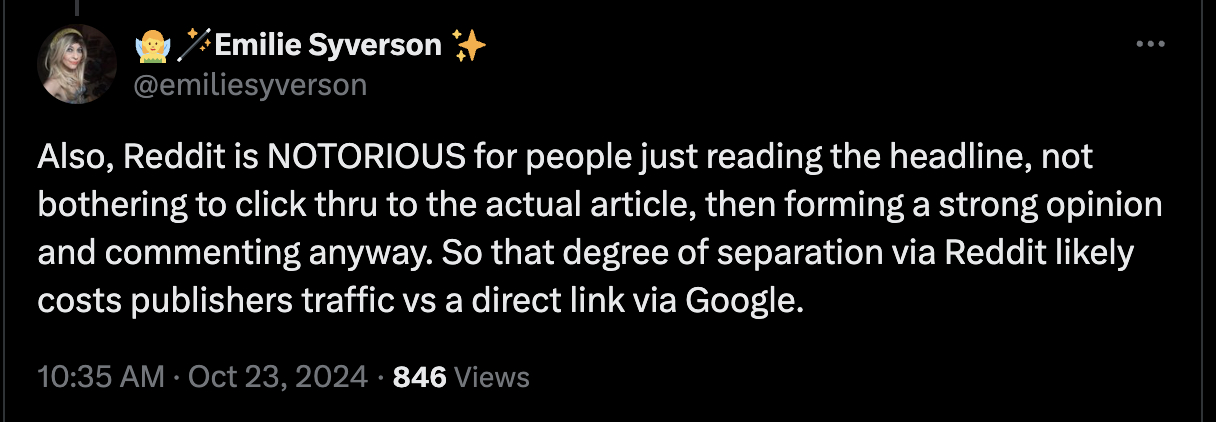In addition, we’re now seeing Reddit Posts sourced in Discover instead of the ACTUAL ARTICLE that it’s linking to. Similar to Syndicated Content/Yahoo, this is not what should be getting surfaced as the “source” for an article.