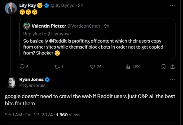 I can understand that maybe Reddit is easier to surface because they moderate, and Google doesn’t have to – but that’s a flawed system.